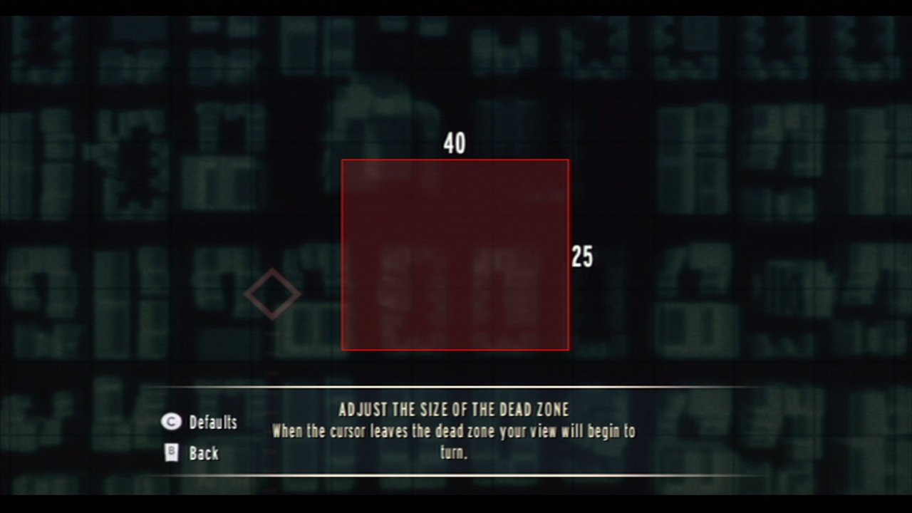 Conduit’s adjustable Horizontal View (their Cursor Look) provides a separate advantage: it is a significant help to the camera fluidity when the Wii Cursor jumps in and out of the Dead Zone. Transitions across the Dead Zone borders were already gentle and gradual, but adding a little tilt really smoothens changes in the camera’s direction when the cursor wildly wipes across the screen.