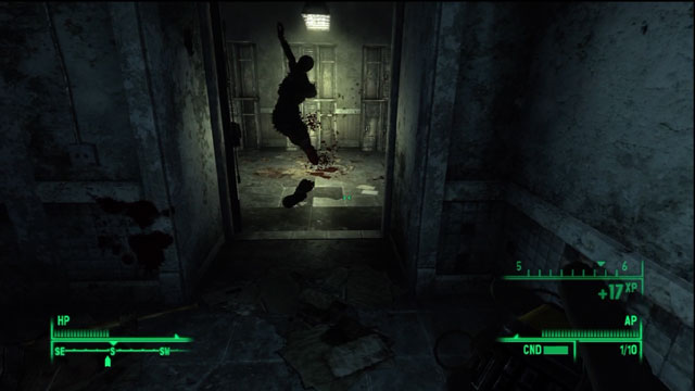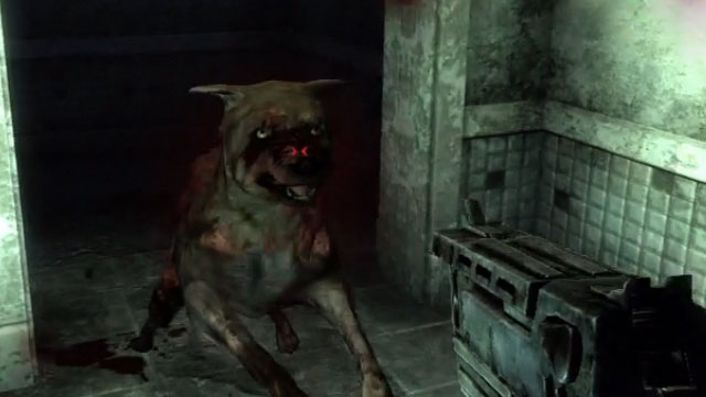 What the fuck! A vicious dog greeted me at the top of the stairs, leaping out of the darkness and straight towards my gun. Shit, this thing was smarter than a raider! It launched with great speed and already had its teeth climbing up my gun towards my hand. I wrestled my arm to gain control and shot it in the mouth. Damn… I probably didn’t need to kill it, that was instinct. Poor thing was probably just hungry.