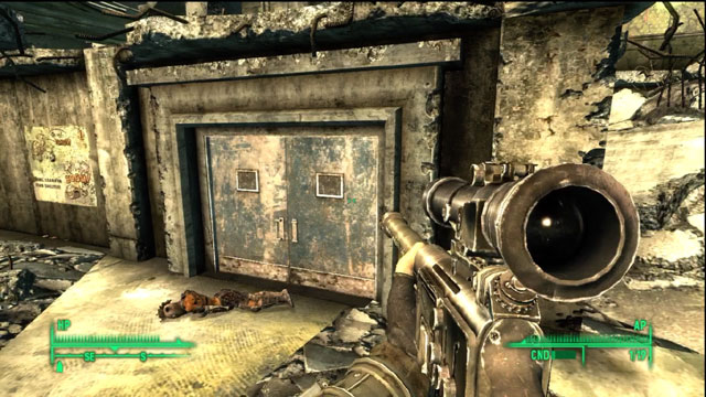 Two raiders talking about “newbies” in their group. How fucking desperate do you have to be to join these guys? Between the laughing and feral spitting sounds I heard something about “monsters” to the north scaring the shit out of them. They laughed at the prospect and didn’t seem to believe the newbies stories of “claws of death”. They had no idea what was out there, haha. Probably born in this shithole. I couldn’t afford to waste too much time listening, their laughter was my opportunity. I stood up and placed myself in the doorway, it was a small room and there were two of them. One of them noticed me and I shot him before he could raise his gun, the other one turned around to meet my second bullet. That was easy as piss. I looked around and grabbed a few medical supplies, jackpot. This room must have been the school nurses office or something, it was hard to tell with all the brown and rubble, the room looked like it was about to collapse. As I headed back to the doorway I found some more bottlecaps on one of the raiders, looks like someone wasn’t sharing.