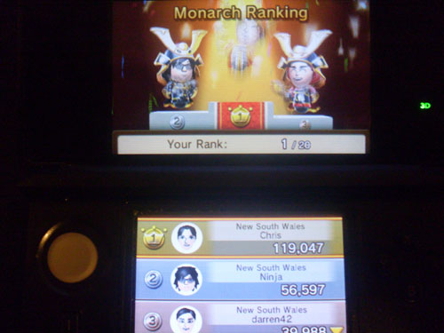 StreetPass Battle is the best game in small doses and I amassed a huge army (currently around 120,000) over the two days, because it’s very easy to check and quickly cycle through Mii’s. You have the option of invading countries but you can choose not to invade, and simply amass troops. This game I feel has the best design because of how accessible it is. I played through this game (and the puzzle one) every time I checked StreetPasses and probably amassed the biggest army there. How do I know this? Not because I’m an arrogant commander, but because there’s a ranking of Mii’s showing how many people they have in their army. Admittedly I stopped challenging other countries in the game to keep my numbers up, just to scare the shit out of people who StreetPassed me.
