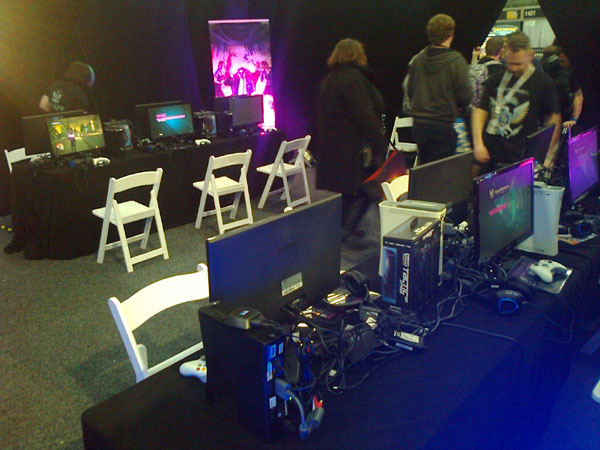 Saints Row 4 was the only 18+ game at the event and a special black wristband was required just to get in. The line looped around the entire block and almost caught up to the front, but because so many people got to play at once the wait wasn’t too bad (about 20 minutes). The black room looked ominous from the outside but had a very impressive setup. 11 consoles were ready with Xbox 360 controllers and giant headphones to enjoy a pleasant session at our own pace. The game itself is amazing, I’m in love with Saints Row after recently playing through Saints Row: The Third. It’s so much better than the first two games and Volition have really embraced the strengths of the franchise. The over-the-top approach is refreshing and it’s great to play an open world game that knows it’s a videogame. The demo gave me about 10 minutes but I already spotted many new things, including a hilarious sounding dubstep gun and a ridiculous black hole gun that sucked up every object in the vicinity. It seemed to take every object that was “destructible” including fences and cars from 20 metres away. The framerate also took a massive hit when it happened but it looked so awesome. Hilarious and potentially useless, but that’s what Saints Row is all about. I then triggered a race which didn’t even require a car. With superman speed I began running through checkpoints, picking up more speed with each one. Then it told me to jump and I thought “alright” not expecting much, but my dude launched about 50 metres into the air over a building and that’s when I knew I had to get this game. The engine felt similar to Saints Row 3 with a less stable framerate unfortunately, but I don’t know if that’s just because the demo had so many things crammed into it.