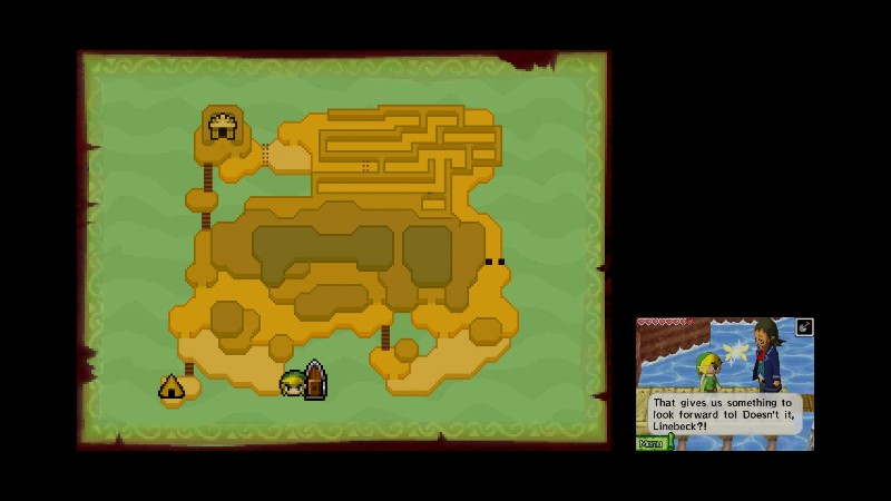 Wii U gives you 6 different screen options for DS games. Above is the one I ended up using for Phantom Hourglass, with an entire screen simply separated and blown up on each screen. The top screen taking up the TV, with the bottom screen taking up the whole GamePad like a gigantic DS. It felt a bit weird at first, just being able to move the GamePad around as if I was ripping a DS in half. However, I quickly got used to it after getting immersed in the game and there are a lot of benefits. The GamePad is a great touch screen and feels gigantic compared to the DS. It makes dragging Link around easier, and gives you a bigger window for circle rolls. Everything from drawing on the map to boomerang throwing feels more liberating and accommodating. I’ve tried all the displays and here’s a quick rundown.