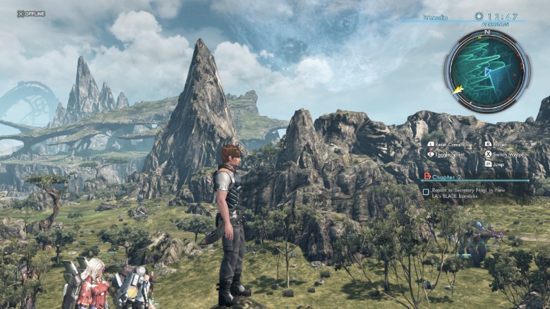 The game’s pacing early on deserves special commendation. Compared to the last Xenoblade, the story is moving along more proactively and the drip feed of new game mechanics is spread out enough that, despite my previous paragraph, I don’t feel overwhelmed. These new mechanics are also being introduced quickly enough, and with minimal explanation, that I don’t feel the game is holding back on me either. Adding to this is the fact that the world of Mira is totally open to me from the first ten minutes into the game. The only thing stopping me from losing myself in the wild unknown are the occasional aggressive, over levelled monster that will wipe me out if I stray into their line of sight, as has happened once already. Xenoblade veterans will know though that the game offers minimal penalty for dying to encourage players to confidently push the frontiers of the game and explore it at their own pace.