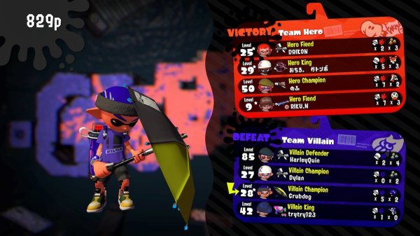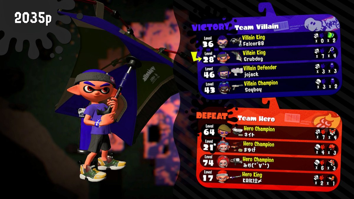 This wouldn’t do. After 7 games of similar disappointment, I ended up with my lowest Splatfest score ever at 1670. Getting matched against Japan may have played a part, but the bigger problem was the villains not working together. Everyone was going for individual glory and conceding all control over the turf in the process. With all logic out the window, I decided that being a villain slayer with one single weapon that I main is not the right approach.