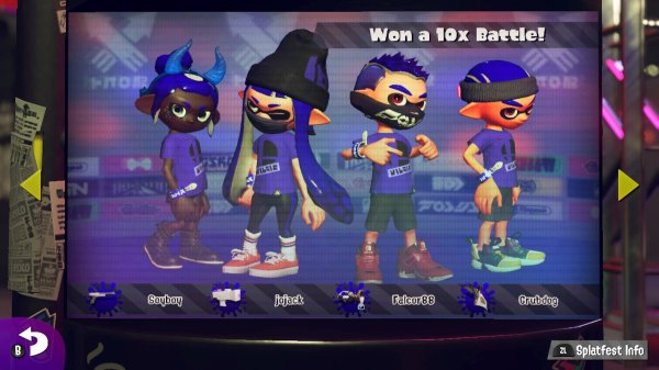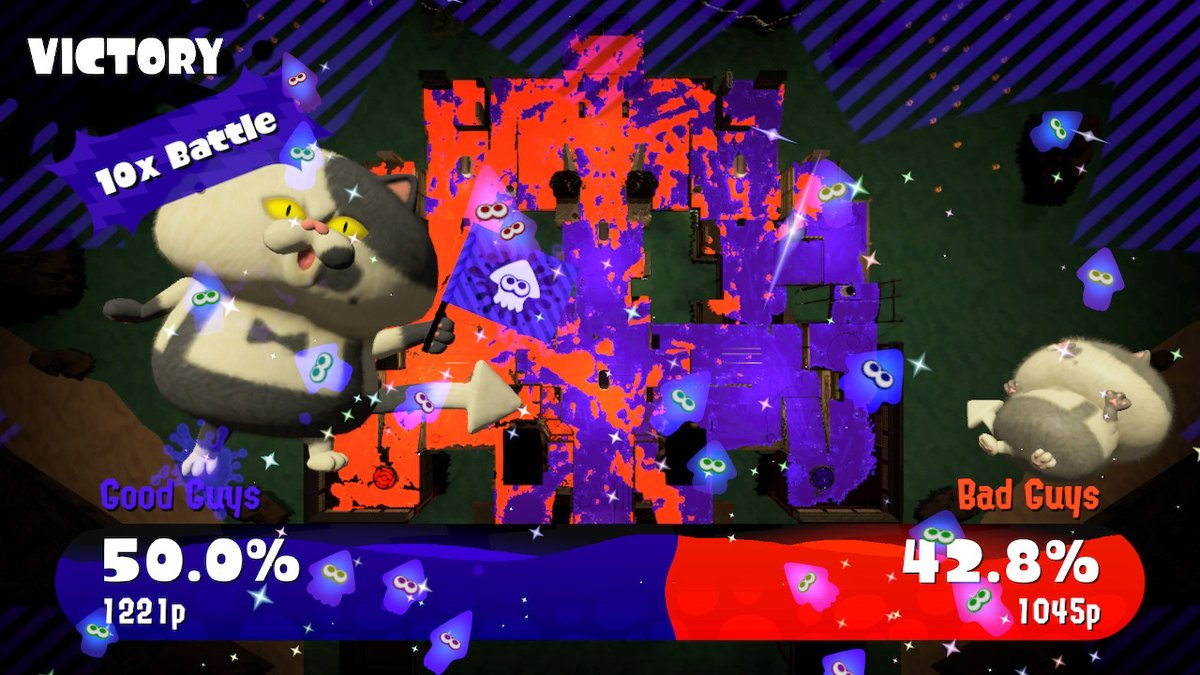 This game ended up being one of the hardest, but most fun battles of my life. Like true greedy villains, everyone’s eyes lit up at the mere sight of a 10x battle. Booyahs flooded the screen and we knew this was our chance. 7 bad games would be completely washed away by the clout on offer here. The game ended up being very close. After how the previous games went, I knew that having 3 good turfing teammates would not be enough. The heroes had a very aggressive octoshot and 3 other weapons that outranged all my teammates. I had to support them with beakons, shields, and win a lot of fights myself. Instead of acting like 4 individual villains, we had to combine to make one big villain. Soyboy and jojack got their ink armours at the right time to dig me out of trouble, Falcor88 got no kills but turfed like an absolute maniac, and I just kept control of the middle with my tent blocking any hope the heroes had in all directions. We lost our fair share of fights but ultimately triumphed.