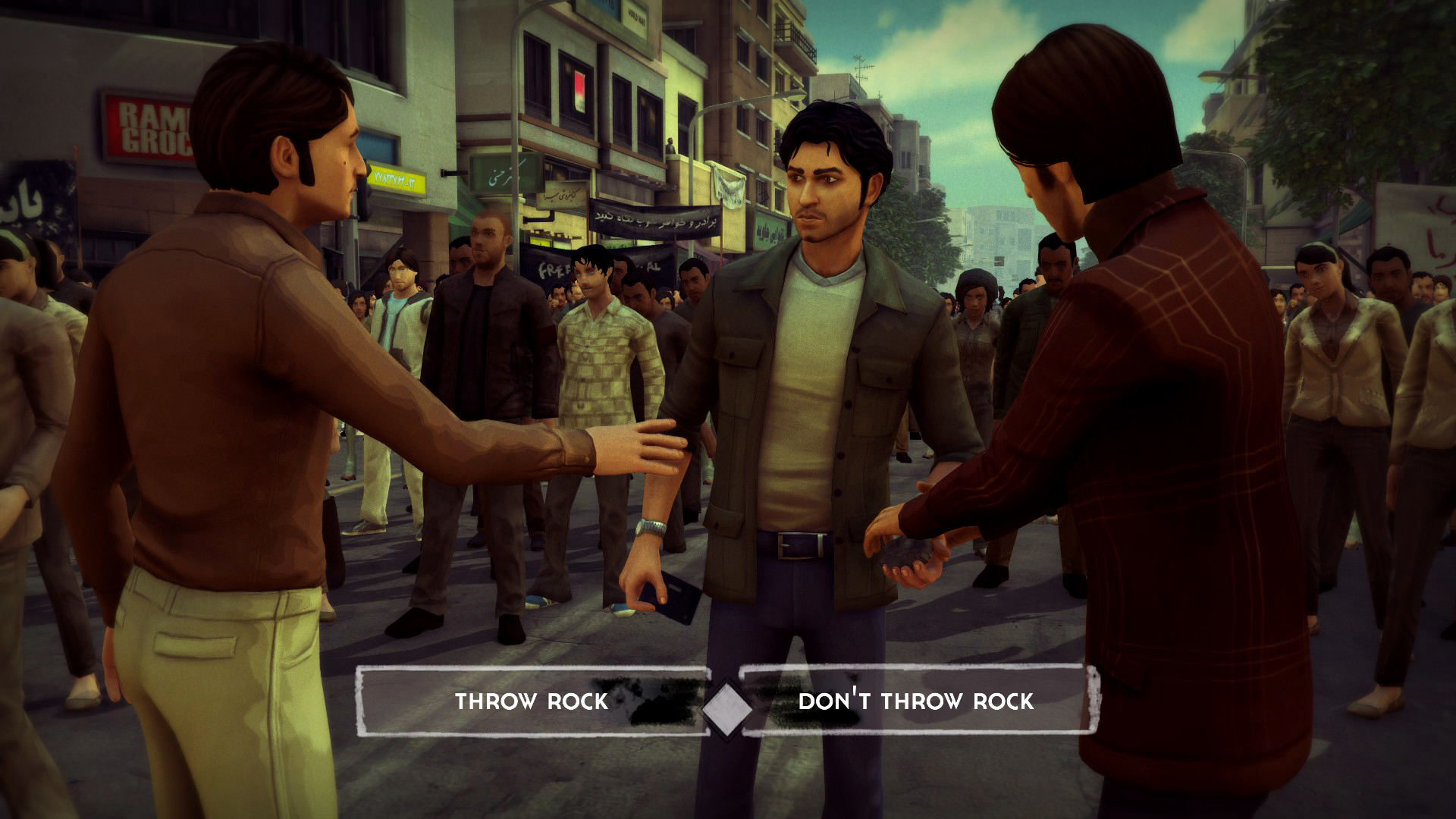 Set across three acts, 1979 Revolution: Black Friday tells the story of teenage photographer Reza Shirazi. Arrested by the Revolutionary Guard in 1980, and placed under torture and interrogation, Shirazi recollects his actions on Black Friday, 1978 and its aftermath. The first act focuses on taking photographs of the demonstrations of Black Friday, where Shirazi learns of the crimes of the Shah. The second act sees Shirazi inducted into the inner circle of the movement and investigate elements of sedition. The final act sees Shirazi grapple with the conflicting loyalties of his friends and family as protests continue. There’s two endings to the game depending on your actions in the last act, with earlier decisions altering cutscenes along the way.