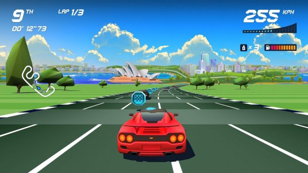 The locations are all based on real places, but not real racetracks. It has that classic arcade style approach where they cram as many different landmarks as possible into any track layout they want. A racetrack around the Opera House? Why not. Kangaroos on the side of the road? Sure. It’s a videogame that can be whatever it wants. This design approach, combined with colourful graphics and huge sense of speed really gives a sense of novelty that makes this game charming from the start. There’s crazy weather thrown in as well, with some rain, snow and even an erupting volcano in Hawaii. Nothing can stop a good race from happening. It plays the unrealistic arcade card to its fullest, and feels extra refreshing if you’ve been playing a lot of realistic games like Forza. It’s a very fun and carefree visual style and I enjoyed going to each location just to see what they would throw into the background.