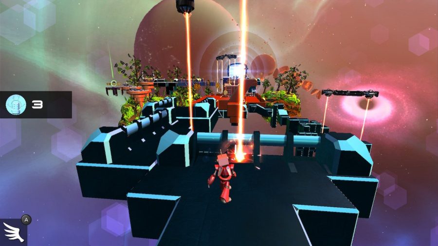 Once you get into a rhythm this game feels pretty amazing. Each level has one branching path that gives you a choice of getting a secret. Sometimes it’s an extra life, sometimes a customisation unlockable. There’s a ton of skins you can unlock for your robot, just to plunge its identity into question even further. You can mix and match different arms, legs, heads and change the colours too. If you only have one life left you might avoid the risk of additional danger, or try your luck getting more lives to build up a supply for the next world. It’s a fun structure and you can move the camera around a bit and judge for yourself if it’s worth getting an extra life, or if you might die trying to get it. I’ve had some branching path choices go badly but that’s part of the fun.