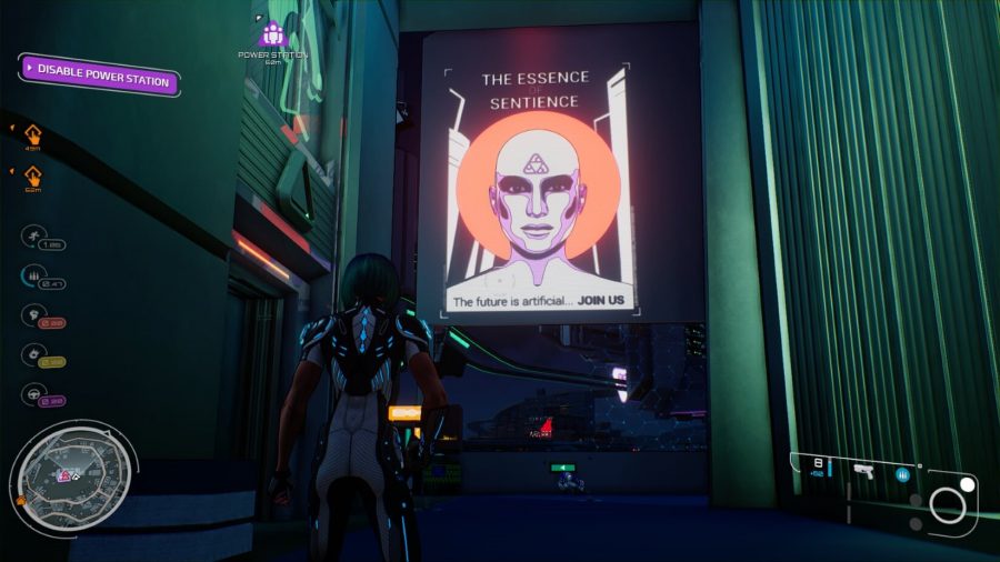 The city is littered with collectibles and missions on the rooftops that really makes the movement the highlight of this game for me. You can see two collectible orbs in the screenshot above, and by the time you get there you can probably see another 2 or 3 orbs in the distance that you can reach. These slowly upgrade your abilities and there’s 500 in total. It’s a very satisfying exploration loop. Sometimes while hunting orbs you’ll stumble upon propaganda towers that you can hack and replace with your own agency message, destroy enemy resources, or find innocent prisoners to free. All in a day’s work.