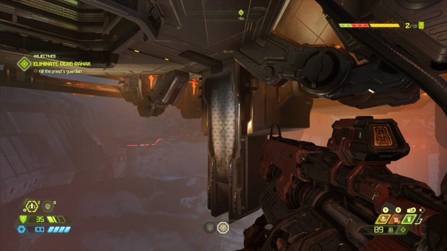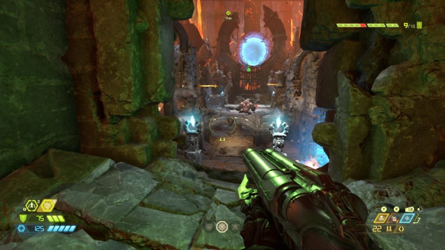 Nice place for a nap. The graphics are absolutely top-tier, but I’m not a fan of the blurry layer of heat the game insists on having at all times. This was also present in Doom 2016 so it’s either a stylistic choice, or just how the game engine works. Even when you turn motion blur and chromatic aberation off in the graphics menu, it still feels like you’re walking around in extremely high temperatures. I personally prefer the cleaner look of games like Borderlands than this smeared, purposefully blurry aesthetic that just makes it difficult to find secrets and doesn’t really provide a benefit. The most amazing graphical moments are seeing enemies close up when you rip them to pieces, or the grand events that sometimes happen in the background. It’s no doubt a spectacular looking game but the low image quality definitely taints it.