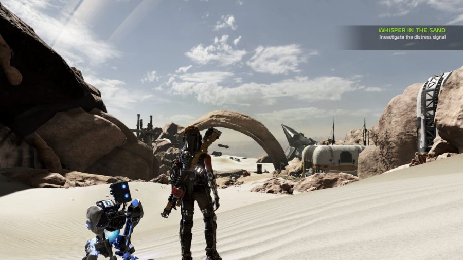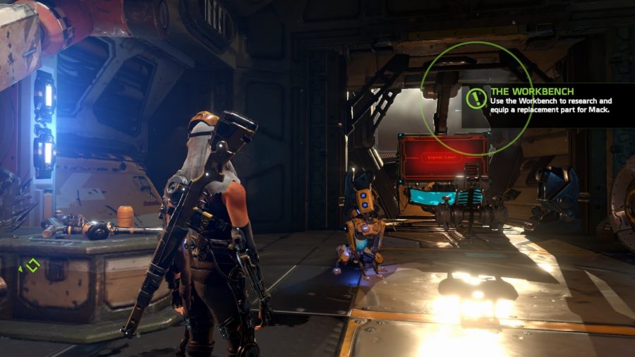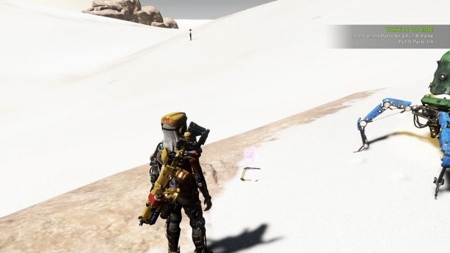 This is meant to be an important collectible… can you see it? This is an audio log which is where most of the game’s story comes from. I enjoyed listening to these, but the clear holographic display made them very difficult to find on bright surfaces. It is a strange design choice, considering the standard material collectibles are much larger and easier to see despite being insignificant. They show up on the map after you go near them, but that’s not a very engaging way to find them.