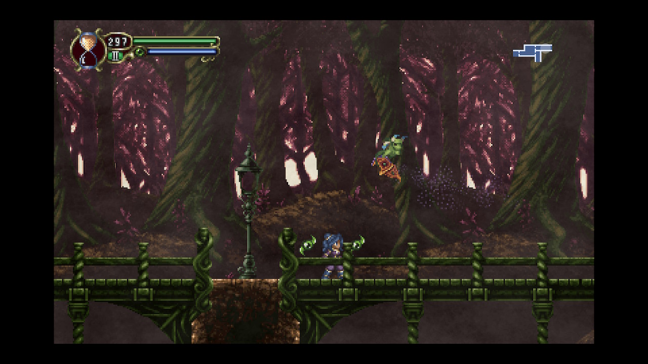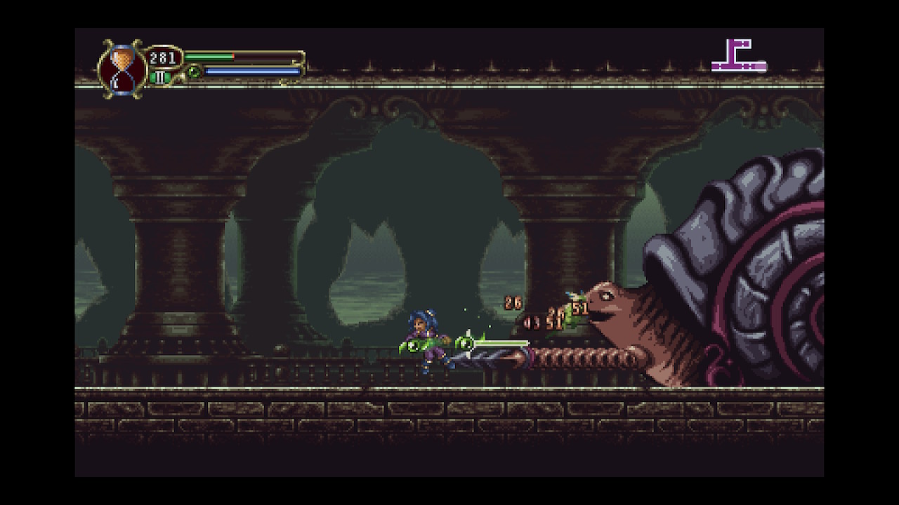 The gameplay and level design is very similar to the GBA Castlevania games, so much that some room layouts are exactly the same, with similar stat menus and equip screens. Timespinner sets itself apart with its futuristic space aesthetic, featuring all sorts of strange creatures running about. Enemies have some fascinating and varied visual design, merging robot technology with biology. It makes me wonder what would actually be better, a high def camera or a real eye? Unfortunately from a gameplay standpoint, the enemies don’t offer too much challenge or variety in their patterns.