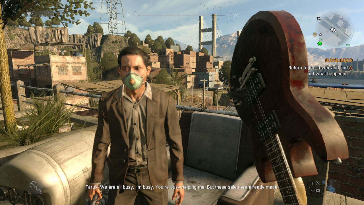 I met another man who couldn’t let go of his dreams. He was a salesman selling uh… some cleaning product, I didn’t catch the name of it. Seemed dodgy. The only cleaning product we needed now was alcohol. I agreed to help him deliver products to his “clients”, who I assume are all dead but I didn’t want to sour his optimism. He was determined to finish his job, zombies or not. It was like they barely even existed to him. I set off some car alarm traps, rocked out on my guitar and threw cocktails around, but it only seemed to attract more and more zombie attention.